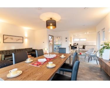 Der offen gestaltete Wohn-/Ess- und Küchenbereich wird durch zahlreiche bodentiefe Fenster lichtdurchflutet und schafft eine harmonische Verbindung zwischen Innen- und Außenbereich.