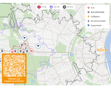 Die Anbindung an den öffentlichen Nahverkehr ist hervorragend. Die KVB-Linie 1 (Haltestellen "Weiden Zentrum" und "Bahnstraße") ist fußläufig erreichbar und ermöglicht eine direkte Verbindung in die Kölner Innenstadt – zum Beispiel zum Rudolfplatz in ca. 20 Minuten. Der S-Bahn Haltepunkt Lövenich ist in drei Minuten erreicht, von hier sind Sie in weiteren 6 Minuten in Ehrenfeld (Einkaufen / Kino / Kultur), in 11 Minuten am Hauptbahnhof (Dom / Philharmonie / Einkaufen) und in weniger als einer halben Stunde sind Sie ohne Umstieg beim Flughafen Köln/Bonn.