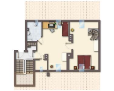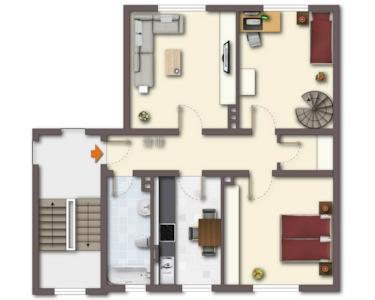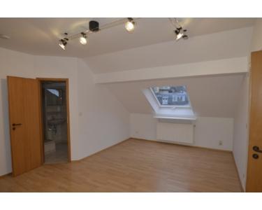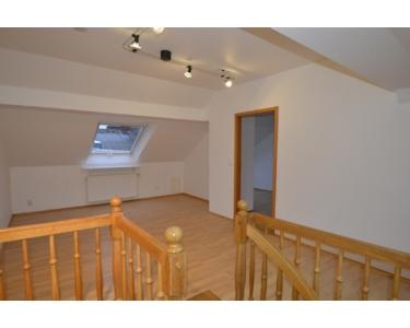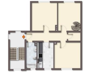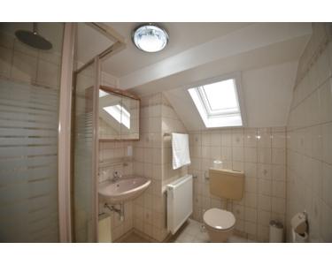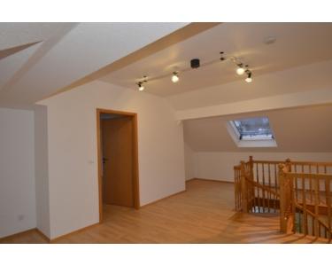 Im hinteren Raum der unteren Ebene führt eine Wendeltreppe in die obere Ebene. Hier finden sich auf ca. 51 m² zwei weitere große Zimmer mit schöner Fernsicht, sowie ein Dusch-Bad (ebenfalls mit Tageslicht) und ein zweiter Abstellraum. Die leichten Dachschrägen machen diese Ebene zu einem gemütlichen Rückzugsort. Velux Dachfenster z.T. mit Solar-Rollladen Funktion bieten hier zusätzlich Schutz für ein ideales Raumklima zu jeder Jahreszeit. Der obere Wohnbereich verfügt über eine separate Wohnungseingangstür und kann somit z.B. als Büro genutzt werden. Die gesamte Wohnung ist frisch renoviert; die Wohnbereiche sind mit pflegeleichten Hartböden (Laminat und Parkett) ausgestattet.