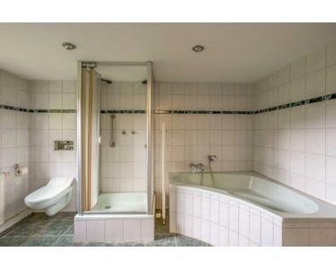 Das große Badezimmer verfügt über ein Fenster, ist raumhoch gefliest und mit einem Fliesenboden ausgestattet. Eckbadewanne, Dusche, Waschbecken, WC sowie Waschmaschinenanschluss sind vorhanden.