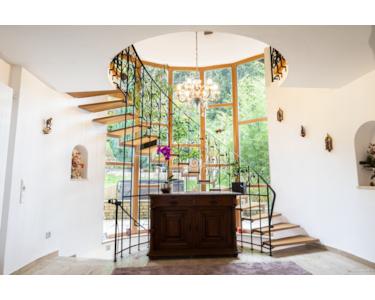 - Repräsentative Architektur mit verglaster, geschwungener Treppe als zentrales Designmerkmal