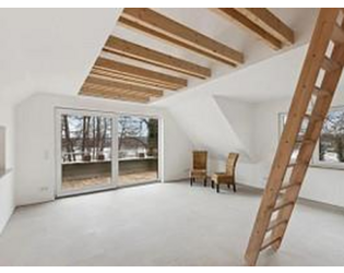 - Wohnraum mit offen ausgebautem Dachstuhl, sichtbare Dachbalken