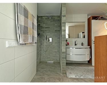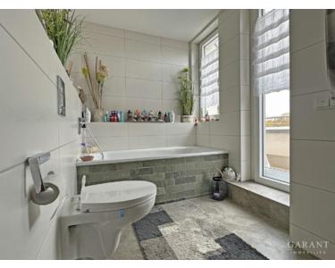 Das stilvolle Badezimmer ist mit Wanne, Dusche, Waschbecken, WC und Waschmaschinenanschluss ausgestattet. Von hier aus gelangen Sie auf eine zweite, kleinere Terrasse, die sich perfekt für den ersten Kaffee am Morgen oder als privater Rückzugsort eignet.