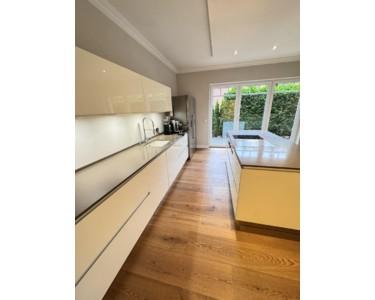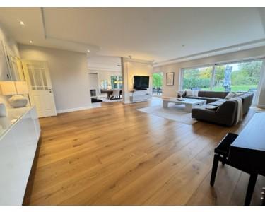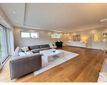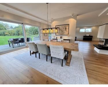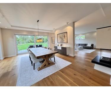 Vom Flur gelangt man sowohl in die sehr große, offene Küche als auch in den weiten Wohn- und Essbereich mit Kamin. Zwei übergroße Schiebeelemente zum Garten sowie zwei zusätzliche Doppel-Terrassentüren sorgen für beeindruckende Helligkeit und fließende Übergänge nach draußen.