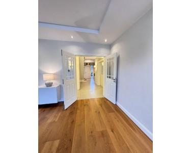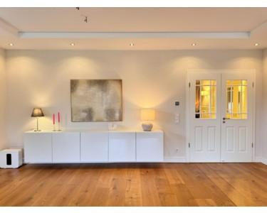 Den Ton gibt ein edler Eiche-Rustikal-Echtholzparkettboden vor. Seine lebendige Maserung verleiht den Räumen Tiefe und Charakter; die geölte Oberfläche fühlt sich natürlich an, ist pflegeleicht und strapazierfähig – ideal für Familienalltag und repräsentatives Wohnen.