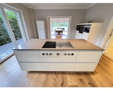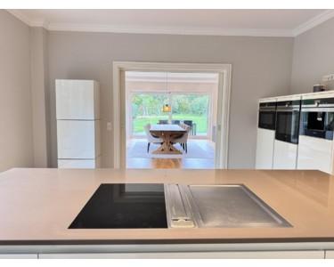 Herzstück des Hauses ist die hochwertige Einbauküche (u. a. Siemens). Langlebige Materialien treffen auf smarte Technik: Das BORA-Kochfeld mit integriertem Abzug zieht Dämpfe dort ab, wo sie entstehen – ohne Haube im Sichtfeld, mit freiem Blick in Wohn-/Essbereich und Garten. Für kulinarische Abende steht ein Teppanyaki-Grill bereit. Der Double-Door-Kühlschrank bietet großzügigen Stauraum; Eiswürfel und Crushed Ice gibt es auf Knopfdruck – perfekt für Gäste und Sommerdrinks.
