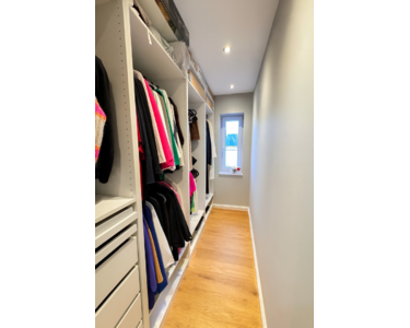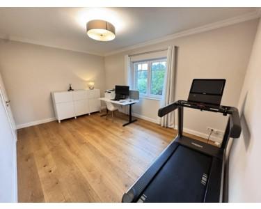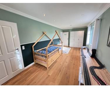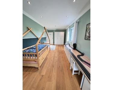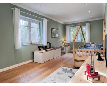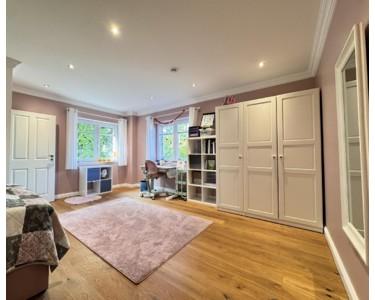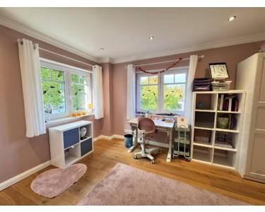Im Erdgeschoss runden Hauswirtschaftsraum und Gäste-WC sowie ein großzügiges Arbeits-/Gäste- oder Sportzimmer (ideal als Home-Gym plus Home-Office) das Raumangebot ab. Die Deckenhöhe von 2,80m unterstreicht das luftige Wohngefühl. Im Obergeschoss befinden sich zwei sehr großzügige Kinderzimmer mit gemeinsamem Duschbad (jeweils en suite zugänglich) sowie die Master-Suite: ein helles Schlafzimmer mit Zugang zur Dachterrasse, ein effizient ausgebautes Ankleidezimmer und ein Vollbad en suite.