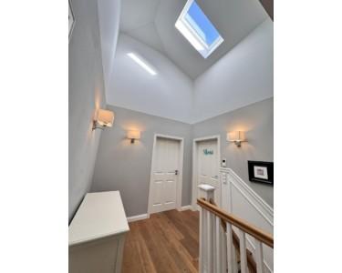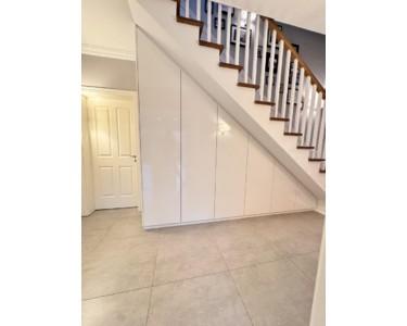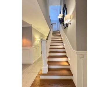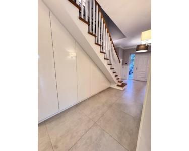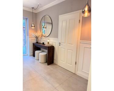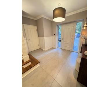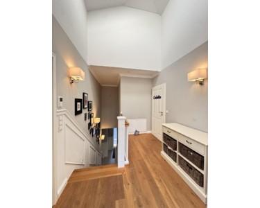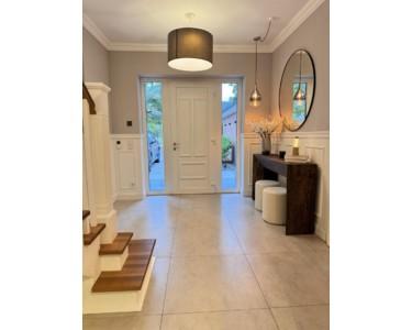 Der einladende, helle Eingangsbereich wird durch die verglasten Elemente der Haustür betont und führt in einen großzügigen Flur mit einer maßgefertigten Garderobenschrank-Kombination unter der Treppe. Bereits beim Eintreten fällt der Treppenaufgang mit eleganter Eichentreppe und Stuckleisten im amerikanischen Stil ins Auge.