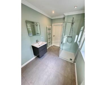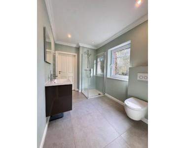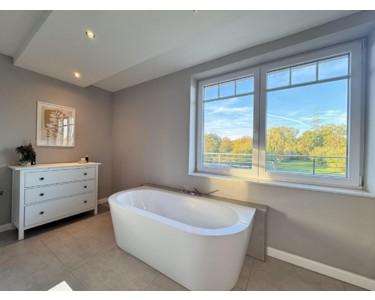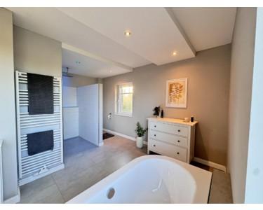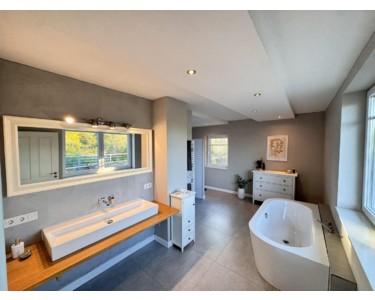 •Badkultur: Kinderbad als Duschbad; Master-Bad als Vollbad mit großem Waschtisch, freistehender Wanne und sehr großzügiger, bodengleicher Regendusche. Sauna-Vorbereitung/Anschluss vorhanden.
