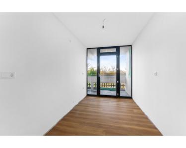 Das Arbeitszimmer/Schlafzimmer ist durch eine integrierte Glastür mit dem Flur verbunden. Diese stilvolle Raumlösung schafft Weite und lässt besonders viel Tageslicht in die Räume fließen – ideal, um den Bereich flexibel als Büro, Gästezimmer oder zusätzliches Schlafzimmer zu nutzen.