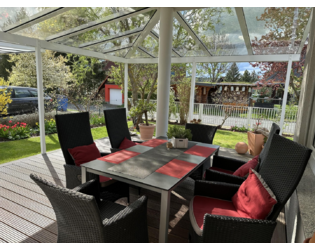Eine 9 m lange Garage sowie ein Carport, ein Schuppen mit Holzlagerplatz und eine mit Holz belegte und überdachte Terrasse machen das Objekt von außen komplett.