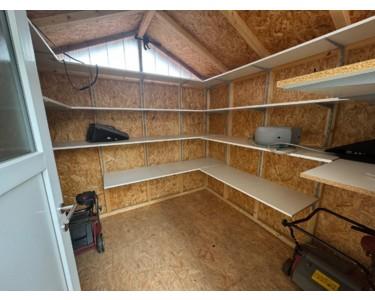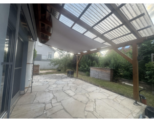Draußen wartet eine große L-förmige Terrasse mit überdachtem Bereich, perfekt für Sommerabende. Ein großzügiges Doppelcarport mit elektrischem Rolltor (2024) und Beleuchtung bietet Platz für Fahrzeuge. Eine angrenzende Holzlege schafft zusätzlichen Stauraum.