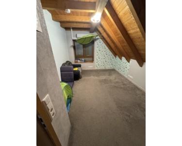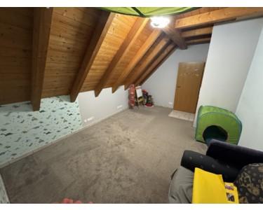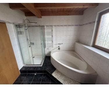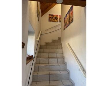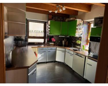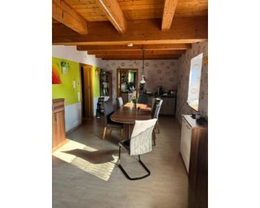 Zum Verkauf steht ein modern ausgestattetes, gepflegtes Einfamilienhaus mit separater Einliegerwohnung in Obervolkach. Das Gebäude aus dem Jahr 1997 ist solide gebaut: 50 cm starke Poroton-Außenwände, 25 cm Holzfaser-Aufdachdämmung und ein sichtbarer Dachstuhl aus gehobelten Balken. Die offene Holzbalkendecke im Erdgeschoss verstärkt den warmen, hochwertigen Charakter des Hauses.
