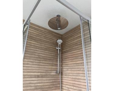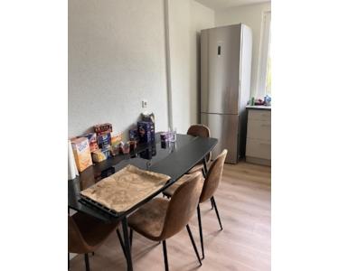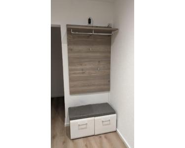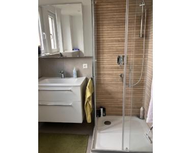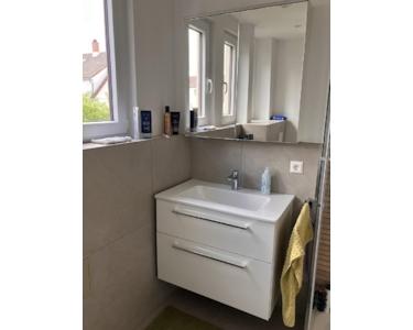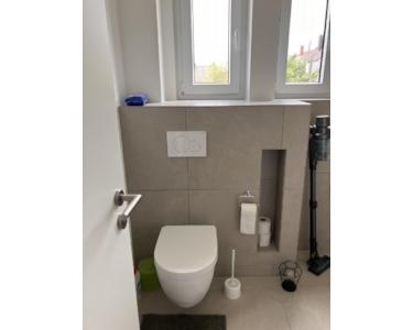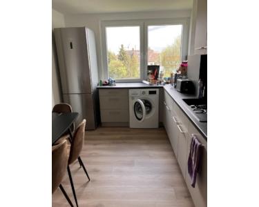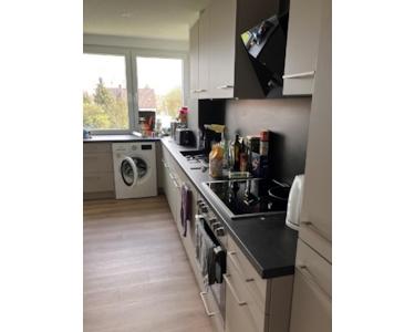 Eine neue Einbauküche (mit Herd und Backofen, Spülmaschine, Mikrowelle, großem Kühlschrank und Waschmaschine) und ein Esstisch an dem die WG Bewohne Platz haben, ist vorhanden. Das neue Bad hat eine Regen-Dusche und WC.