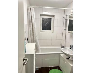 Das Badezimmer verfügt über eine Duschwanne und ein Fenster, das für angenehme Belüftung und Tageslicht sorgt.