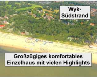 Topp-Lage in Wyk-Südstrand. Nur ca. 200 m Zum Sandstrand. Ein mit vielen Büschen eingefasstes Grundstück garantiert entspannte Stunden auf der Terrasse oder in Garten auf der Wellness-Liege. Zum schönen Wyker Sandstrand sind es nur wenige Meter. Die Wyker Innenstadt ist schnell zu Fuß oder mit dem Fahrrad erreichbar. Restaurants sind in der Nähe, genauso ein Bäcker, Metzger und ein Lebensmittel-Geschäft,