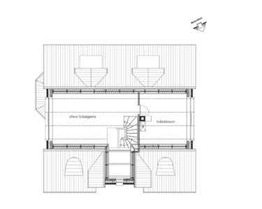 Die offenen Galerie im DG ist in zwei durch eine Tür getrennte Bereiche aufgeteilt. im vorderen Teil in einen Schlafbereich mit 2 Einzelbetten ausgestattet, im hinteren Teil in einen Arbeitsbereich mit einem großen Schreibtisch direkt vor dem Fenster.