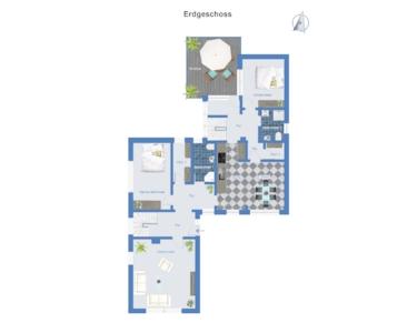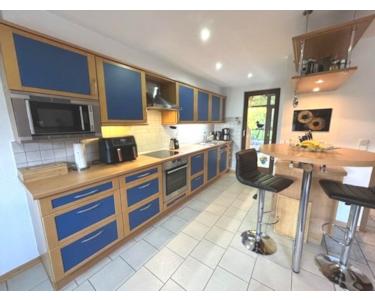 Im Erdgeschoss (134 m²) gibt es eine große Wohnküche mit großzügiger Einbauküche, ein schönes Wohnzimmer mit Echtholzparkett, zwei Bäder, zwei Abstellräume (davon eine Speisekammer) und zwei Schlafzimmer. Die große Wohnküche ist offen gestaltet und beinhaltet eine große Einbauküche.