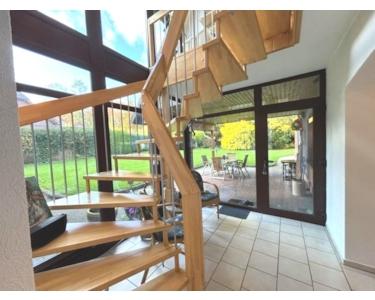 Insgesamt verfügt das Haus über acht Zimmer, drei Bäder und drei Abstellräume, zwei Treppenaufgänge, sowie einen Dachboden und einen Spitzboden. Es wirkt hell, lichtdurchflutet und modern.