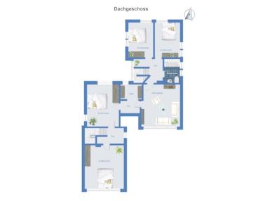 Insgesamt gibt es im Dachgeschoss fünf Schlafzimmer, sowie ein Badezimmer und ein Abstellraum bieten weiteren Platz. Selbstverständlich gibt es im Dachgeschoss im Bad eine Fußbodenheizung.