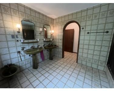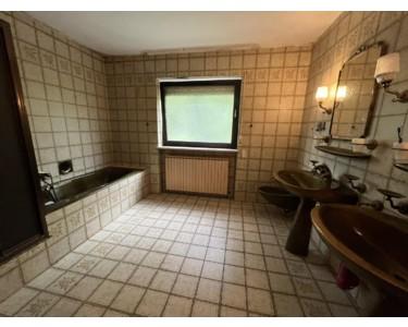 •Ein Badezimmer mit Doppelwaschbecken Badewanne und Dusche, renovierungsbedürftig