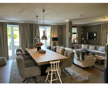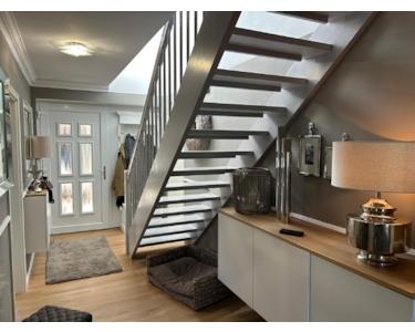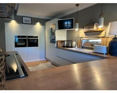 Bereits beim Betreten des ca. 162 m² großen Hauses, vermittelt der imposante Wohn-Essbereich ein Gefühl von Wärme und Behaglichkeit. Der offen gestaltete Wohn- und Essbereich mit Kaminofen und direktem Zugang zur Terrasse besticht durch klare Linien, große Fensterfronten und eine weiße Design-Einbauküche, die keine Wünsche offenlässt. Auf dieser Wohnebene befinden sich noch ein Gäste-WC mit Tageslicht, ein HWR sowie ein Zimmer, welches derzeit als Büro genutzt wird.