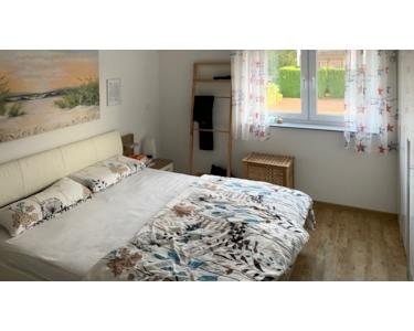 Vom einladenden Eingangsbereich öffnet sich das großzügige Wohn- und Esszimmer, das dank großer Fensterflächen viel Tageslicht erhält und einen direkten Zugang zum eigenen, liebevoll angelegten Garten bietet. Die überdachte Terrasse schafft zusätzlichen Raum zur Entspannung und macht den Außenbereich nahezu ganzjährig nutzbar. Die offene Küche befindet sich praktischerweise auf der rechten Seite des Wohnbereichs und fügt sich harmonisch in das Gesamtbild ein.