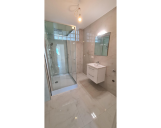 Stilvolles Badezimmer mit Dusche, Spiegel & Waschbeckenunterschrank
