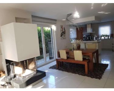 Das Haus besticht durch seine moderne Architektur, lichtdurchflutete Räume und eine durchdachte Raumaufteilung. Große Fensterfronten sorgen für viel natürliches Licht, während der offene Wohnbereich durch den Kamin zusätzliche Behaglichkeit schafft.