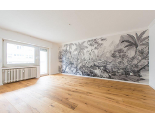 Ihr zukünftiges Zimmer bietet ein neu verlegtes Echtholzparkett aus Eiche im Verlegtyp breite Landhausdiele. Die Wände der Wohnung sind allesamt frisch gespachtelt und gestrichen worden. Eine der vier Zimmerwände hat eine Dekortapete von modernen Hersteller "Fotowall" mit dem Muster "Taintet Jungle". Damit es keinen Streit in der WG gibt, :-) sind alle drei Zimmer mit dem gleichen Motiv ausgestattet worden.
