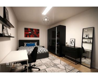 Das Schlafzimmer ist geräumig und bietet genügend Platz für ein großes Bett und einen Kleiderschrank. Es ist ein ruhiger Rückzugsort, der durch seine Lage im hinteren Teil der Wohnung Privatsphäre gewährleistet.