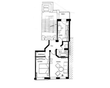 Zur Wohnung gehört neben Wohnzimmer und Schlafzimmer weiterhin ein kleiner Abstellraum sowie ein Kellerraum.