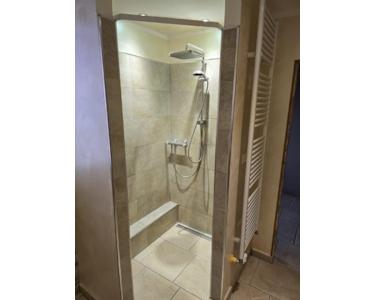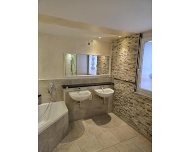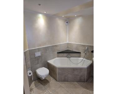 Durch die Treppe gelangen Sie in die 1. Etage. Zur linken Seite ist das Elternschlafzimmer nebst Ankleideraum. Geradeaus finden Sie eine Abstellkammer. Zur rechten Seite kommen Sie in das geschmackvoll und mediterran eingerichtete Bad mit Eckbadewanne, Regendusche, WC und 2 Waschbecken. Auch eine Handtuchheizung ist hier zu finden, sowie den angrenzenden separaten Hauswirtschaftsraum wo Waschmaschine und Trockner bei uns ihren Platz gefunden haben.
