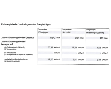 Als Basis für die Energieangaben wurde vom Eigentümer und dessen Architekten mitgeteilt, dass die Ausbaustufen der Büroanteile "wohnbereichsähnlich" ist und somit der wohnbereichsähnliche Anteil mehr als 50% beträgt. Entsprechend ergeben sich die Angaben zur Energie wie folgt: