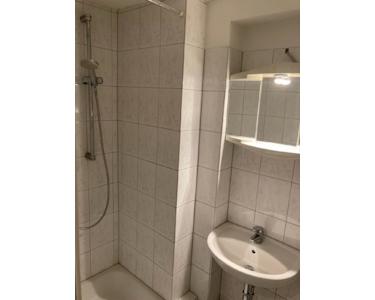 Das weiß geflieste Badezimmer ist mit einer Dusche und einem großen Fenster ausgestattet, das für angenehmes Tageslicht und optimale Belüftung sorgt.