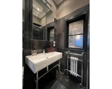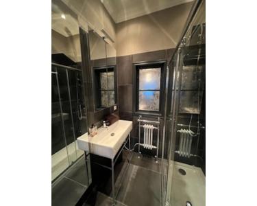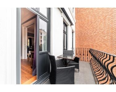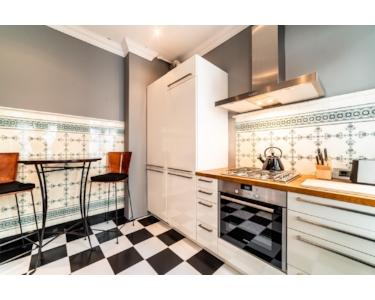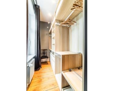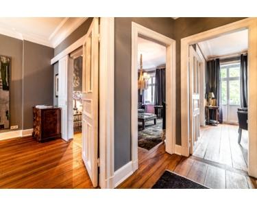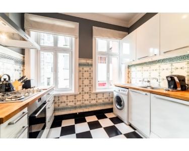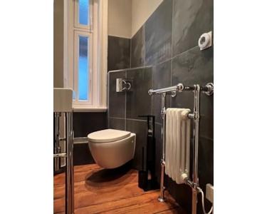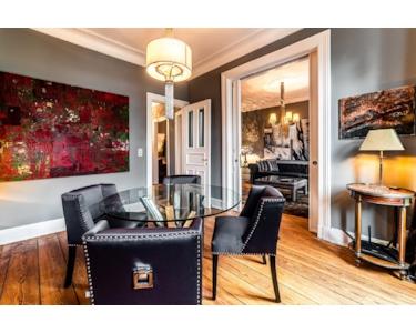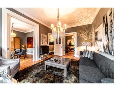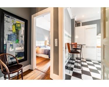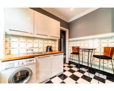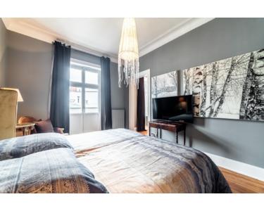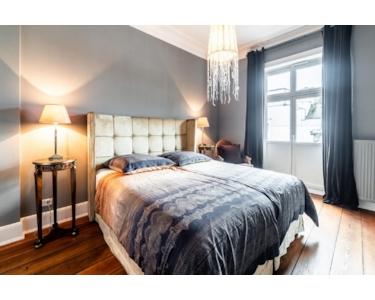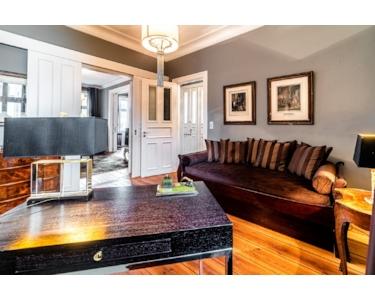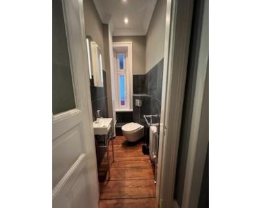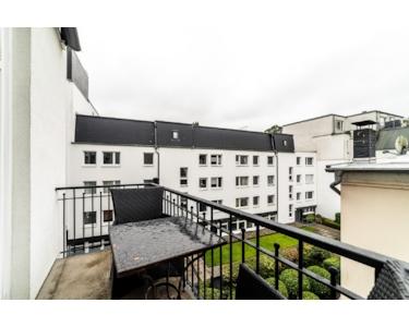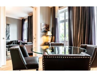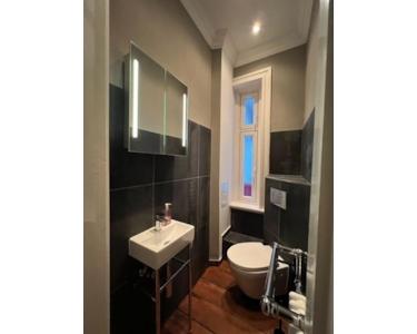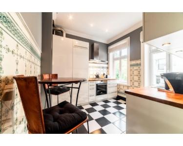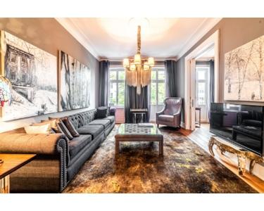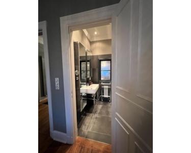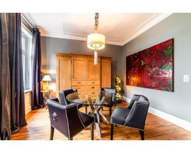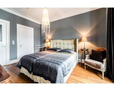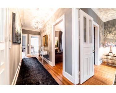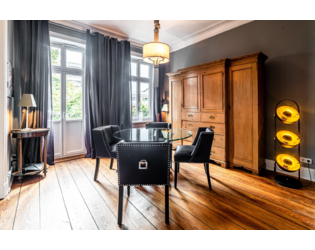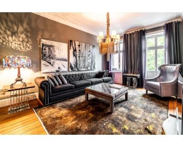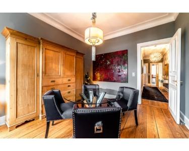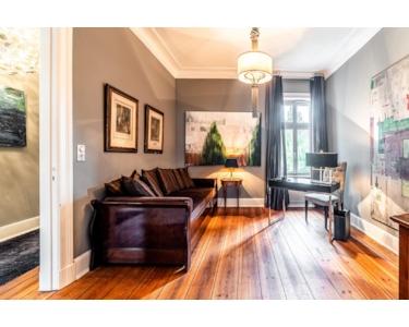 Die 4-Zimmerwohnung im 2. Obergeschoss mit Pitchpine-Boden, beeindruckt durch seine exklusive Einrichtung in einer Kombination aus Antiquitäten und Designklassikern. Hohe Decken, fein verputzte Wände, historische Stilelemente wie beispielsweise Stuck, Schiebetür zwischen Wohn- und Esszimmer sind meisterhaft aufgearbeitet. Wöchentliche Reinigung der Wohnung nach Vereinbarung mit gesonderter Rechnung.
