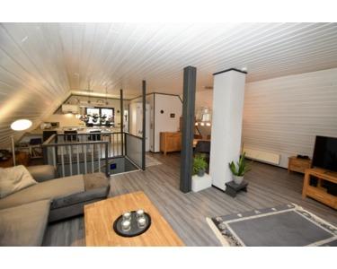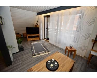 Der Wohnbereich mit offener Küche, Essecke und Wohnzimmer mit Süd-Balkon befinden sich auf einer Ebene im Dachgeschoss.