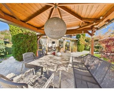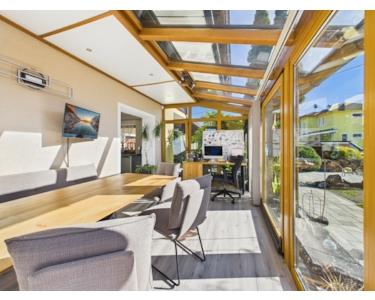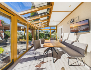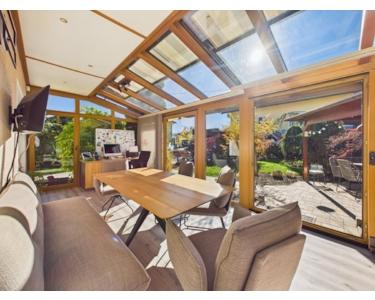 Besonderes Augenmerk verdient der südseitige Wintergarten, der nahtlos an den offenen Wohnbereich anschließt und durch großflächige Glasfronten einen harmonischen Übergang in den Garten schafft. Von hier aus gelangt man auf die großzügige Terrasse, die mit einer eleganten Pergola und einem raffinierten Sonnenschutzsystem ausgestattet ist. Eine Aufglas-Markise sorgt auch an heißen Tagen für angenehmen Schatten und macht diesen Bereich zum idealen Rückzugsort für sonnige Stunden im Freien.