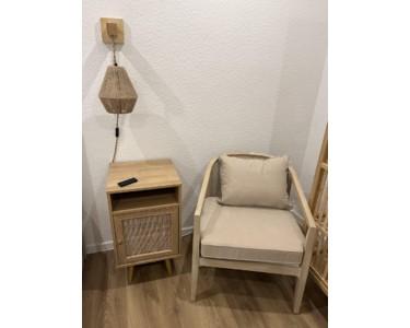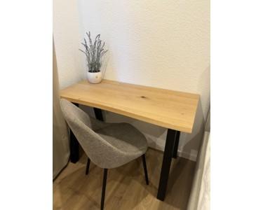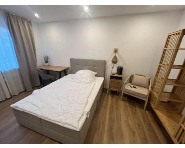 Zum Zeitpunkt der Bilderaufnahme wurde die Wohnung an zwei Personen vermietet. Aktuell wird die Wohnung an eine Person vermietet, die Möblierung wurde Anfang des Jahres angepasst. Das Wohnzimmer ist klassisch eingerichtet mit Schlafsofa, Esstisch und vier Stühlen, Fernseher, Kommode sowie einem Arbeitstisch mit Stuhl.
