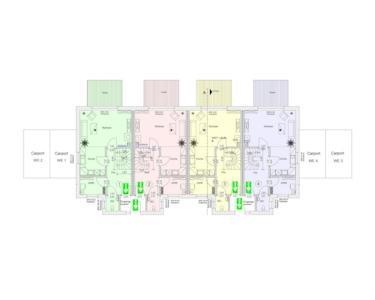 •einem Carport mit einem angeschlossen Geräteraum (3*3m) je Wohneinheit