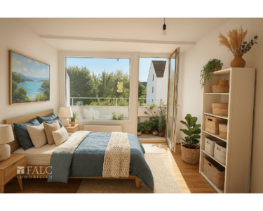 Im Schlafzimmer, das zur ruhigen Seite des Hauses ausgerichtet ist, befindet sich der Zugang zum Balkon. Hier können Sie entspannt frische Luft genießen oder den Abend ausklingen lassen. Große Fenster sorgen auch in diesem Raum für eine freundliche, helle Atmosphäre.