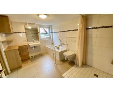 Der Hauptwohnraum im Obergeschoss überzeugt mit einem großzügigen Wohnzimmer inklusive gemütlicher Leseecke oder Bürobereich sowie einem Kaminofen, der für wohlige Wärme sorgt. Angrenzend befindet sich das helle Esszimmer mit Zugang zum großen Balkon – mit herrlichem Blick ins Grüne. Die Küche ist geräumig und lädt zum gemeinsamen Kochen ein. Ebenfalls auf dieser Etage: ein Schlafzimmer sowie ein altersgerecht modernisiertes Badezimmer mit Dusche und Badewanne.