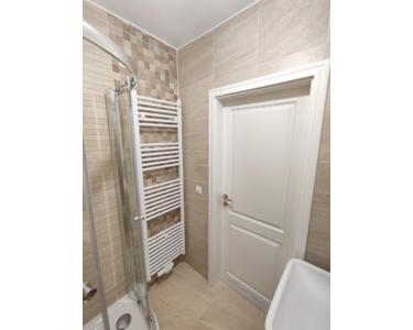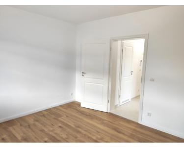 Die helle Wohnung ist mit Wohnungseingangstür und Zimmertüren im Landhausstil und mit Fußbodenlaminat in Eiche-Dekor ausgestattet. Die Böden in Flur, Bad und Küche sind gefliest.