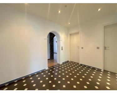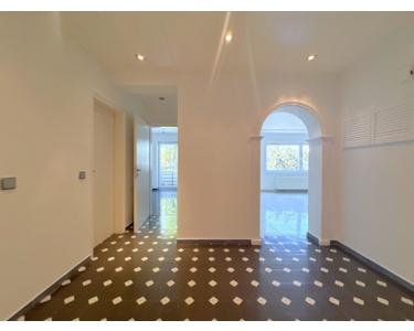 Über die linke Seite gelangen Sie durch einen der beiden stilvollen weißen Rundbogen und einen separaten Flur zu den zwei geräumigen Schlafzimmern. Geradeaus laufen Sie auf das Gäste-WC sowie das Badezimmer mit Badewanne zu.