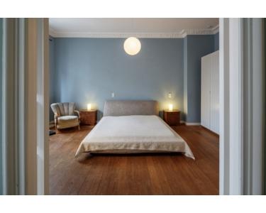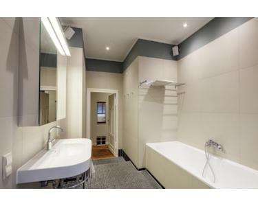 This perfectly proportioned front-facing flat with a bay window on the third floor of a turn-of-the-century building features many original or refurbished details such as stucco ornamentation, wooden doors with brass fittings, stripped wooden floorboards and wooden-framed windows with double glazing. A sophisticated colour scheme accentuates the 3.38 m high stucco ceilings and creates a spacious and elegant feel.