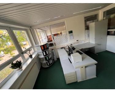 Ein Bürotrakt mit 6 Büros und Teeküche mit großem Lager, 1 Vollgeschoß, Massivbauweise, 2 Rolltore, Baujahr 1995, 8 Stellplätze für Autos, Damen und Herren WC, Serverraum, Aktenraum, Alle Büros sind mit einem Datenkabel und Telefonkabel versorgt