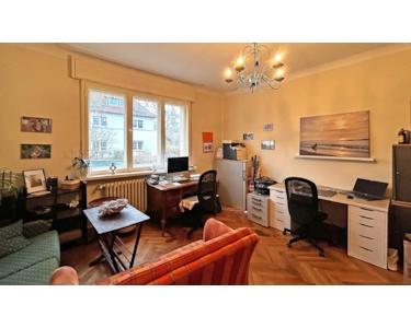 Diese denkmalgeschützte Villa verfügt über sieben schöne Zimmer sowie zwei ansprechende Wohnzimmer, die mittels einer Schiebetür zu einem großzügigen Salon erweitert werden können. Hier befindet sich auch ein offener Kamin. Es gibt zwei Badezimmer
