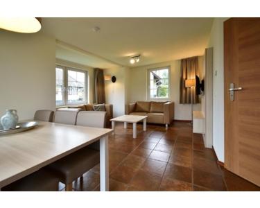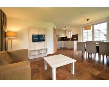 Das Wohnzimmer ist hell und gemütlich mit zwei Ledersofas, Couchtisch und TV-Möbel eingerichtet. Große Fenster auf drei Seiten sorgen für viel Tageslicht und Blick ins Grüne rund um das Haus. Der Esstisch mit sechs Stühlen steht an der Terrassentür, sodass Innen- und Außenbereich harmonisch ineinander übergehen. Der Fliesenboden ist pflegeleicht und ideal für ein Ferienhaus.