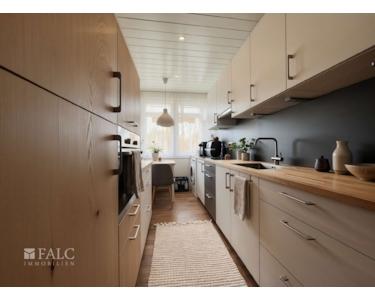 Im Wohnzimmer, in den Schlafzimmern sowie im Flur wurde ein hochwertiger Laminatboden verlegt, der nicht nur optisch ansprechend wirkt, sondern auch pflegeleicht und langlebig ist. In der Küche liegt Vinylboden. Die Küche gehört dem Mieter, kann auf Wunsch abgekauft werden.
