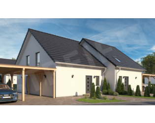 Die Gestaltung dieses Doppelhauses besticht durch ein Satteldach und einen Zwerchgiebel mit Flachdach, was von Anfang an eine behagliche Atmosphäre schafft. Die charakteristischen Dachschrägen im Inneren schaffen besonders gemütliche und geschützte Schlafbereiche, die das Wohlbefinden der Bewohner fördern.